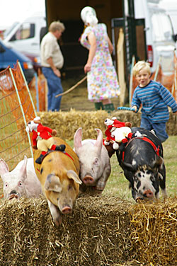 The handlers, in country outfits, encourage them using food to race down the track while they take the hurdles in their piggy stride.